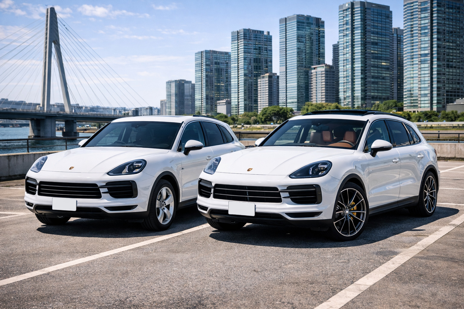 オプションなしの「素」のカイエンと、21インチRSスパイダーホイールにレザーインテリア、パノラマルーフを装備したカイエン。